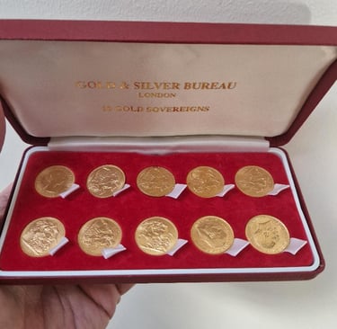 No exact figures exist but the best estimate of how many Sovereigns were ever minted stands at a figure in excess of one billion coins! It's hardly a surprise then that we see a constant flow of these lovely coins coming into stock. No sooner are they in than they are out which is good business for us. We pay a fair price for them and sell to our regular customers at a hard to beat price. Only yesterday this charming collection of ten coins in a presentation case came in netting the owner a very substantial amount of money within 15 minutes of meeting with us. Negotiable anywhere in the world these are arguably the benchmark gold coin on an international basis. Small. easy to store, totally free of VAT and capital gains tax they are an ideal addition to any investment portfolio and have done rather well by way of return over the last few years.